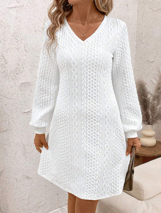 V-neck A-line Skirt Solid Color Texture Long Sleeve Temperament Elegant French Dress